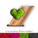 Flauschig weiches Islandmoos in der Farbe der Liebe, behutsam auf eine hochwertige Holzfaserplatte aufgebracht mit einem einzigartigen Standfuß aus Altholz.