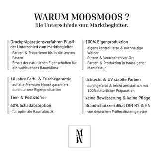 Bei uns wird das Moos bis in die letzte Faser gefärbt und präpariert. Marktbegleiter hingegen besprühen oder lackieren ihre Moose lediglich. Durch dieses Verfahren erhalten wir die einzigartigen Eigenschaften der Moose wie z.B. die Luftfeuchtigkeitsregulierung. Das Moos kann weiterhin Feuchtigkeit aufnehmen und diese bei einem trockenen Raumklima wieder abgeben - wie in der Natur. Das sorgt für ein optimales, natürliches Raumklima welches sich stressreduzierend und wohltuend auswirkt.