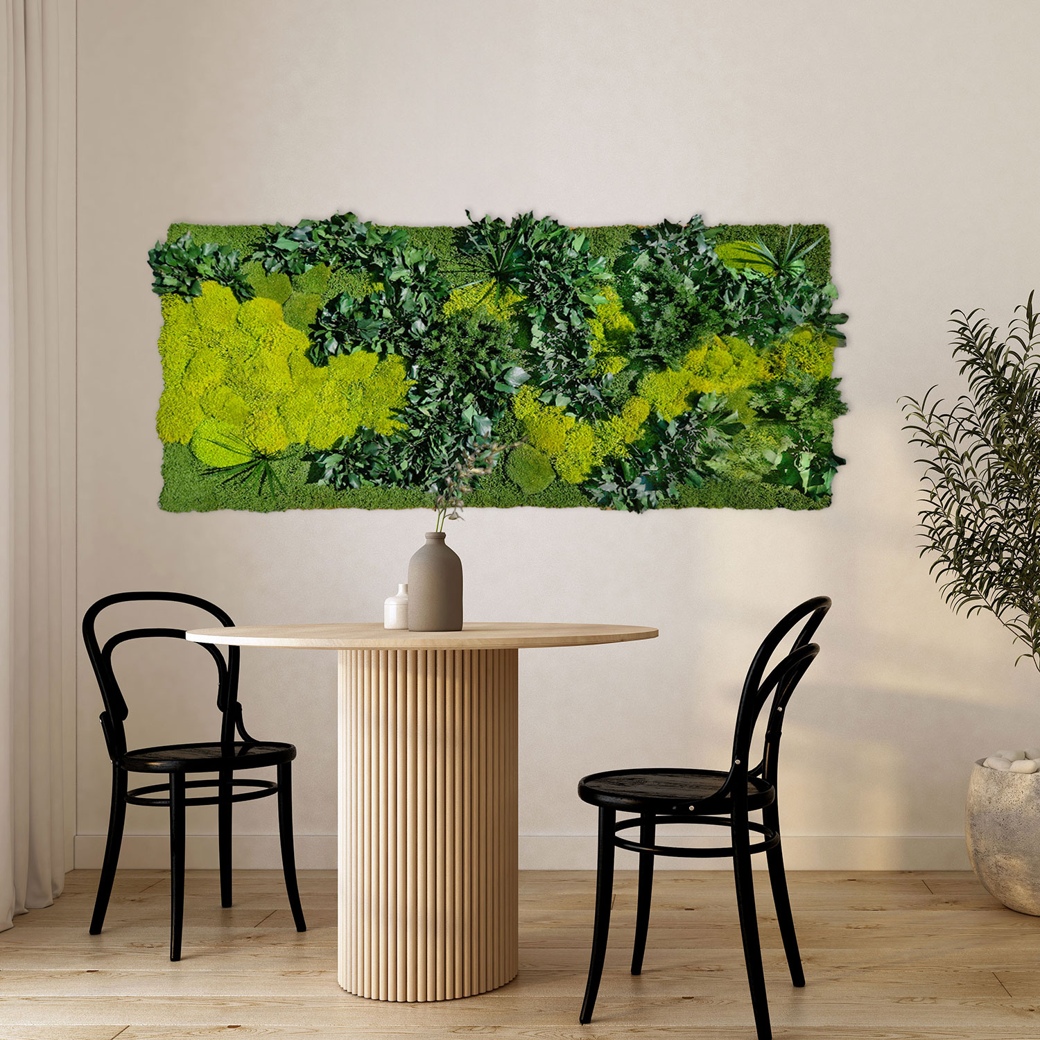 Urban Forest ist ein exklusives, pflegefreies Moosbild, das natürliche Wandbegrünung mit modernem Interior Design verbindet. Das hochwertige Naturbild kombiniert konserviertes Waldmoos, Ballenmoos und ausgewählte grüne Pflanzen zu einer harmonischen, organischen Komposition. Die fließende Linienführung erinnert an natürliche Waldlandschaften und macht jede Wand zu einem stilvollen Blickfang. Dieses Moosbild für den Innenbereich bringt die beruhigende Wirkung des Waldes direkt in Wohnräume, Büros, Praxen oder Empfangsbereiche – ganz ohne Bewässerung, Licht oder Pflegeaufwand. Dank professioneller Konservierung bleibt das Moos dauerhaft frisch, farbstabil und formschön. Neben der ästhetischen Wirkung verbessert Urban Forest die Raumakustik, wirkt schallabsorbierend und trägt zu einem angenehmen Raumklima bei. Damit ist das Moosbild nicht nur ein Designobjekt, sondern auch eine funktionale Lösung für moderne Raumkonzepte.